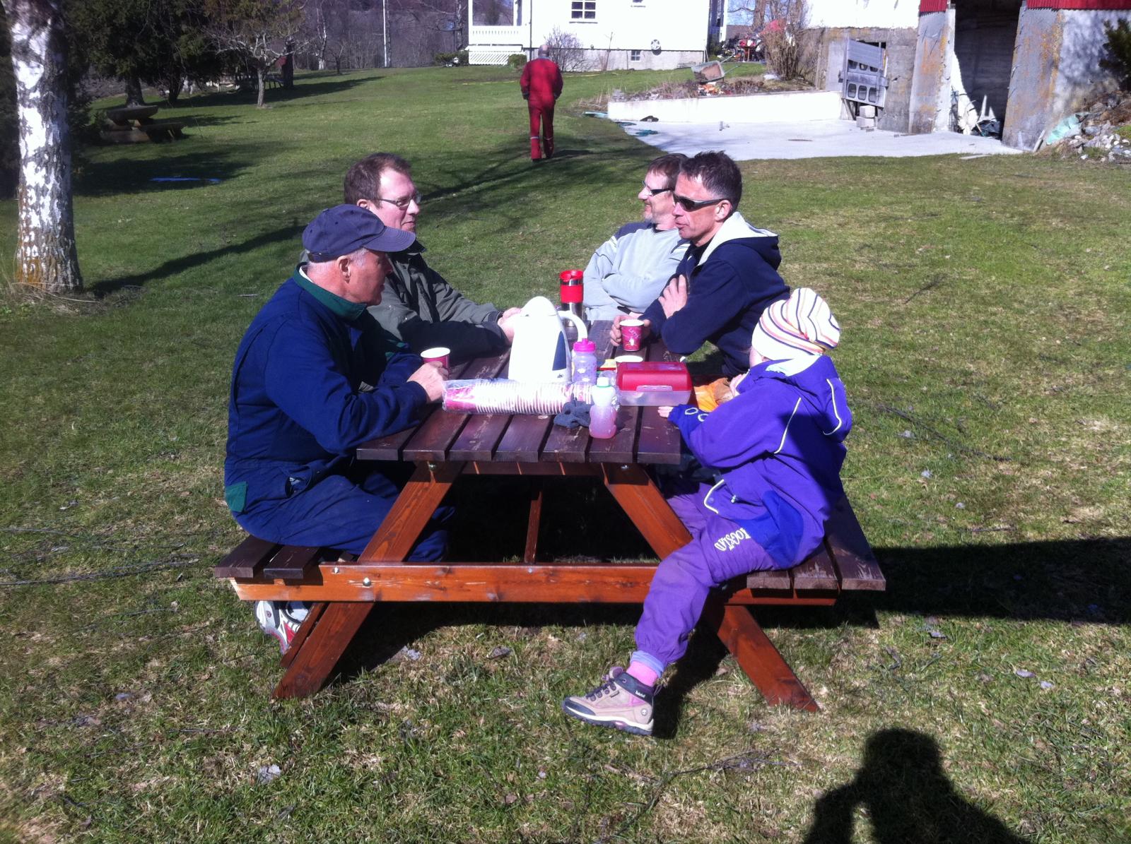 Kaffepause måtte det være i det fine været. Rundt bordet sitter Tor Thorsen, Bjørn Rangul, Harry Lysvand, Jan Arne Engan og Margrete Kålen.