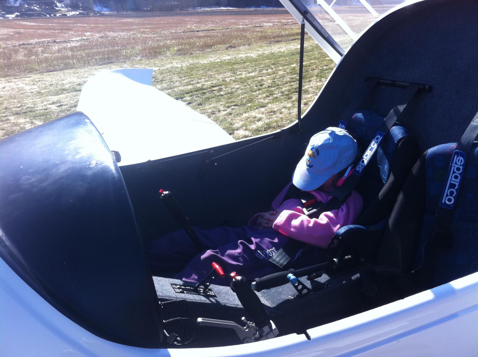 Ingen flyskrekk her i gården nei! Margrete sovnet godt i Zephyren på hjemturen.